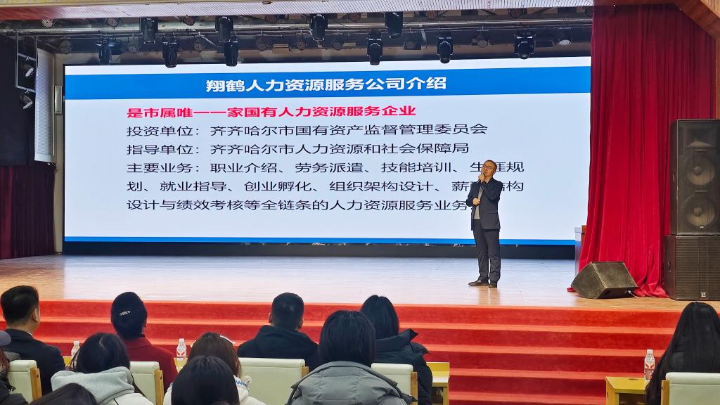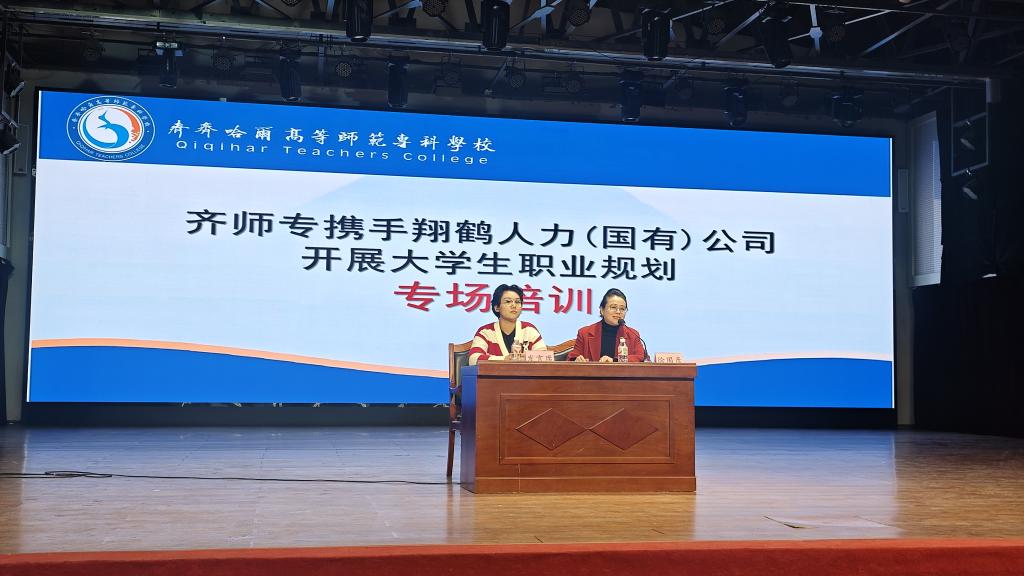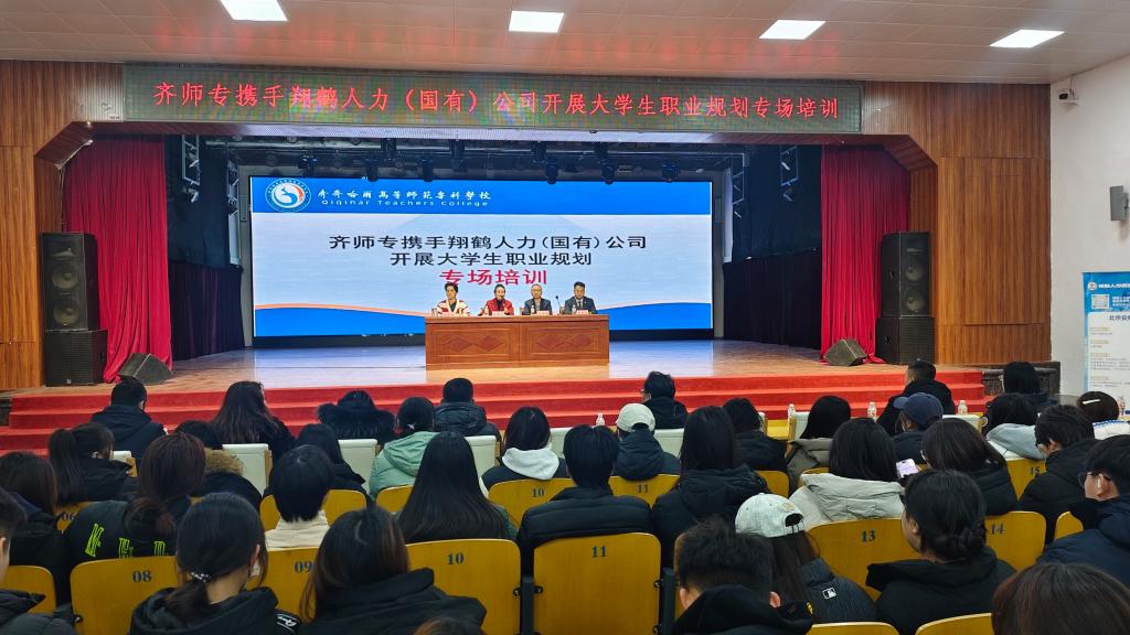 为助力学生明晰职业方向、提升就业创业能力,落实2026年国家级评估师生培训指标,推进就业创业孵化基地建设,12月24日下午,我校联合齐齐哈尔翔鹤人力(国有)资源有限公司,在大学生活动中心举办“立足高职教育,规划职业蓝图”大学生职业规划专题培训。本次培训采用线上、线下相结合的形式开展,校内外师生共同参与。副校长金瓯及各系学管主任、辅导员参加会议。