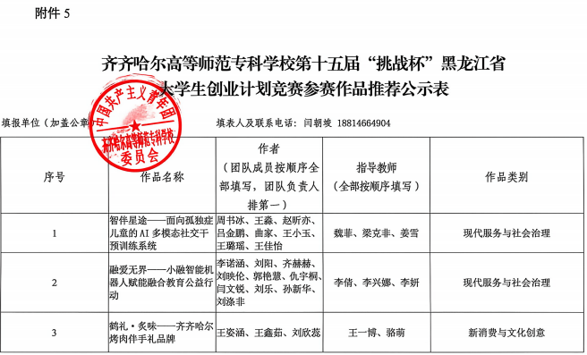 根据《关于举办第十五届“挑战杯”黑龙江省大学生创业计划竞赛的通知》及相关工作安排,学校组织开展了参赛作品的申报与评审工作。经团队自主申报、系部初审、校级复赛,拟推荐以下作品参加省级竞赛,现予以公示。